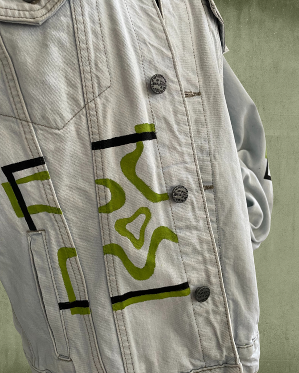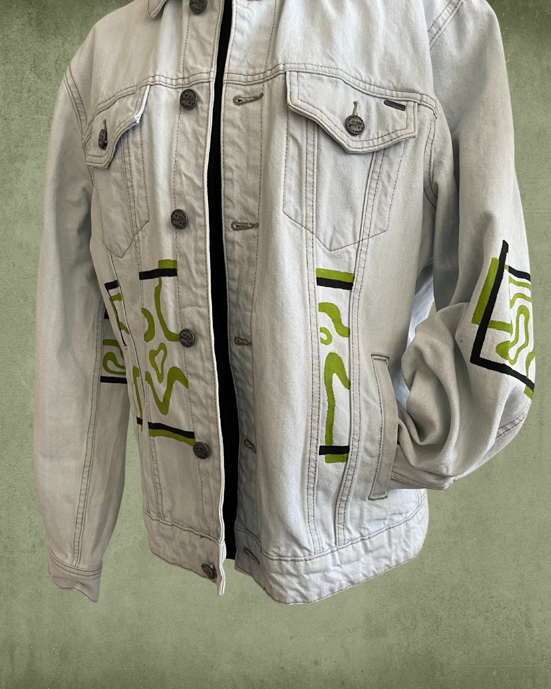 Het TRIPPY LINE design op een denim jack. Het met de hand gemaakte ontwerp is uniek en geschilderd op een pre-loved item. Hierdoor zal het nooit exact kunnen worden gereproduceerd en heb jij een persoonlijk en uniek stuk om te dragen!