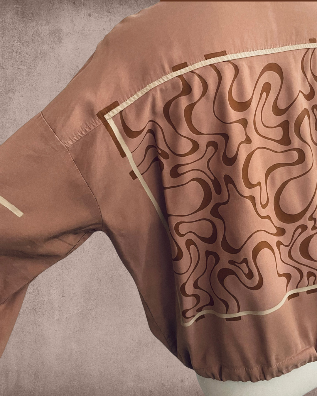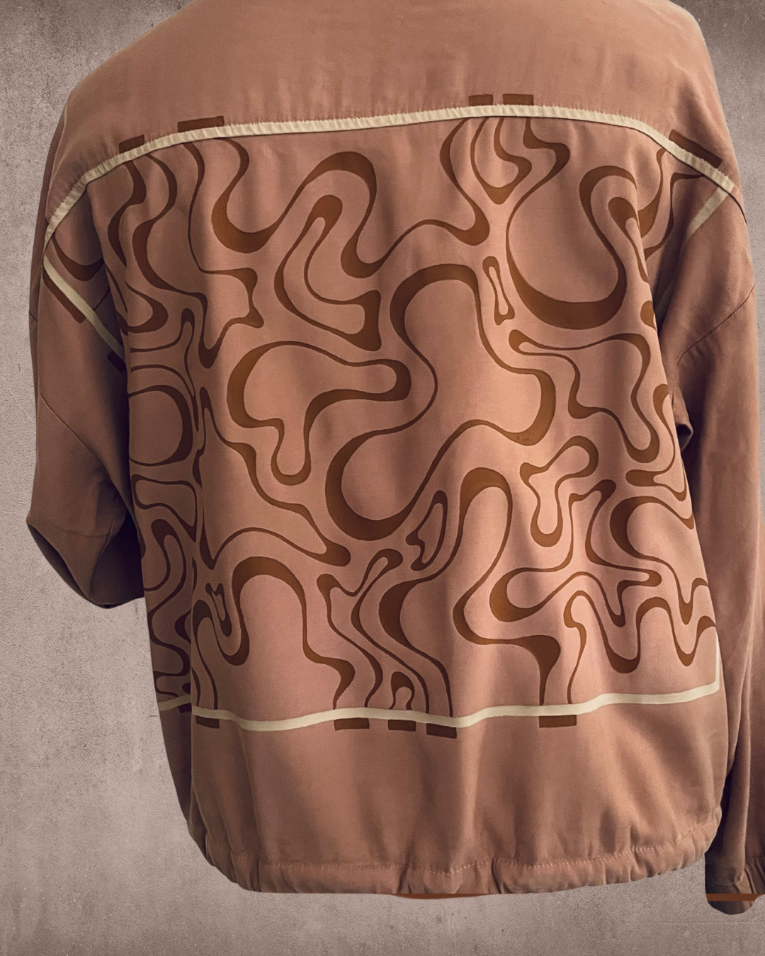 Het TRIPPY LINE design op een katoenen lichtgewicht jasje met rits en drukknopen. Het met de hand gemaakte ontwerp is uniek en geschilderd op een pre-loved item. Hierdoor zal het nooit exact kunnen worden gereproduceerd en heb jij een persoonlijk en uniek stuk om te dragen!