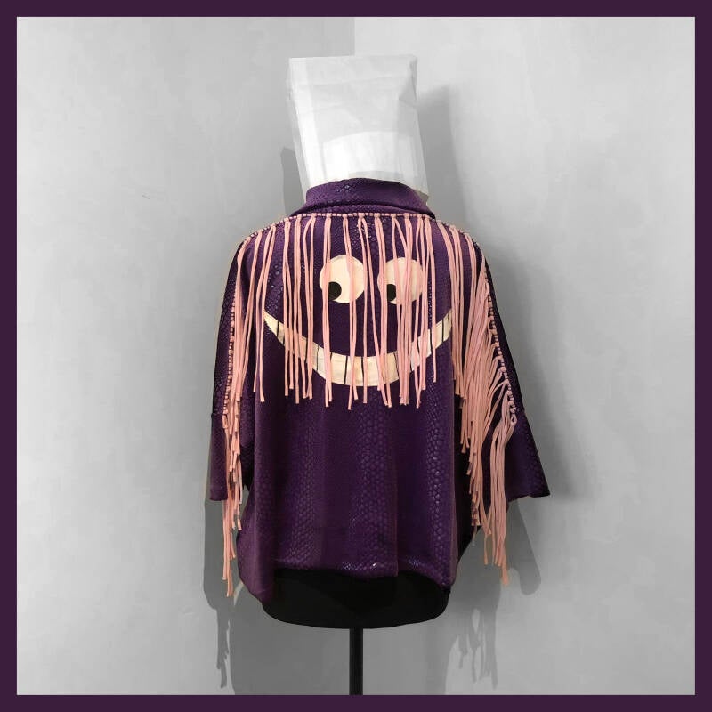 The theme for this exposition got me so excited that very quickly knew I also wanted to make an item inspired by the Cheshire cat. I found this perfect purple colored and unique zip up at the second hand store in Hoorn and hand painted eyes and a mouth on an old curtain as patches. This same day I found a pink t-shirt of which I made the yarn, which I then added with a hand embroidery technique.